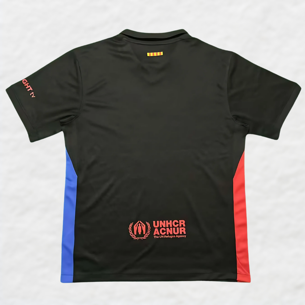 The Barcelona 2024/25 black away jersey features sleek black with golden accents, combining elegance and performance. The iconic crest and subtle design create a bold, modern look.
