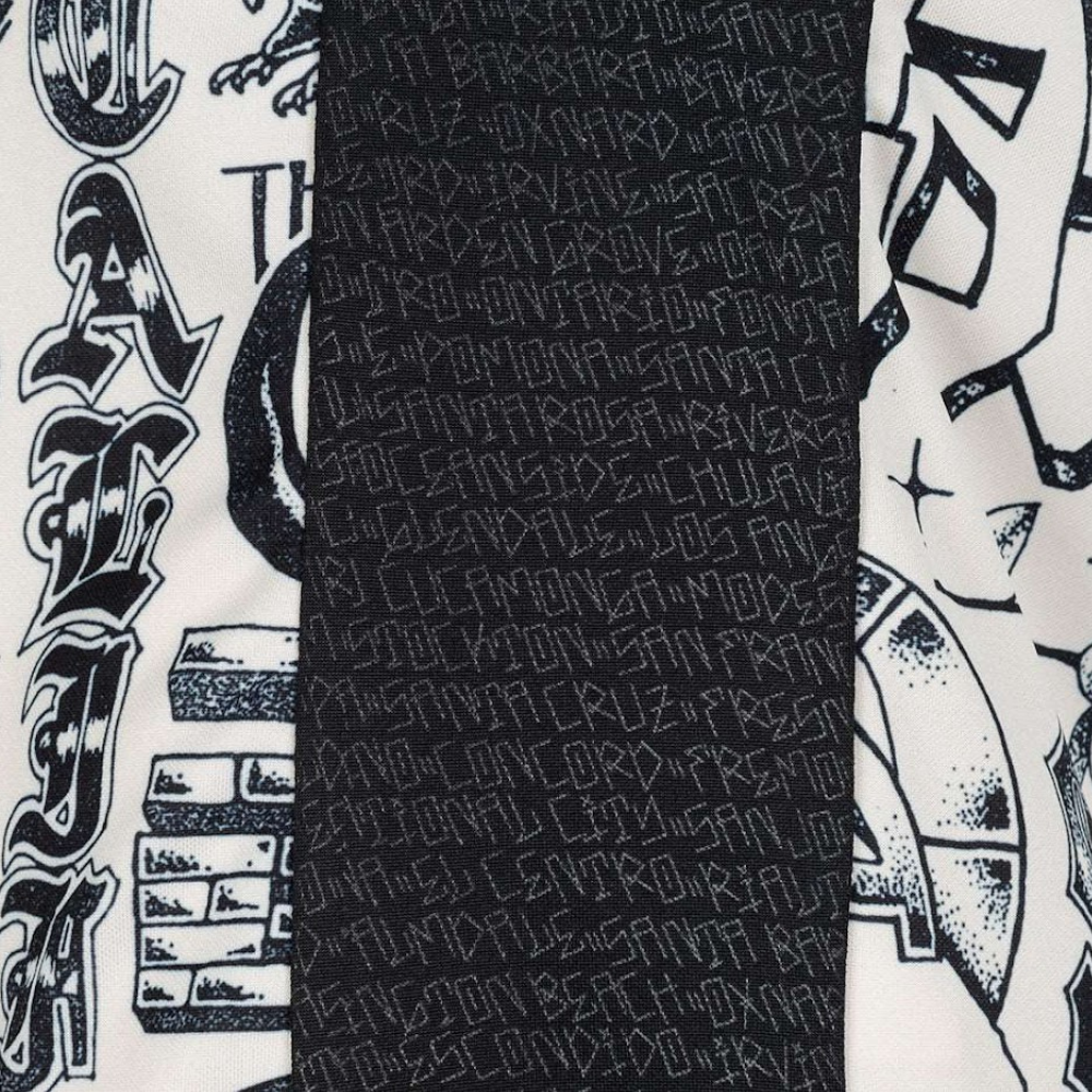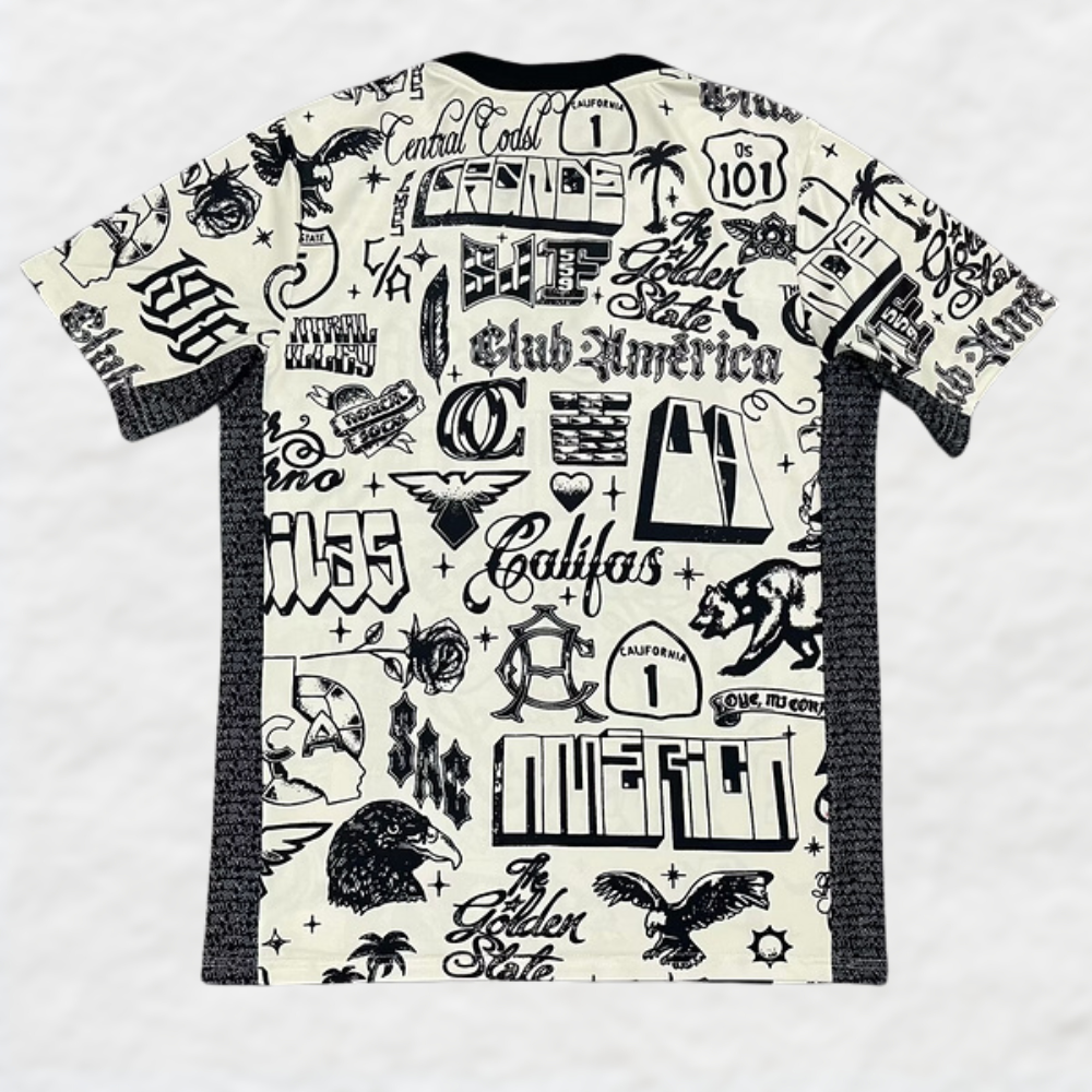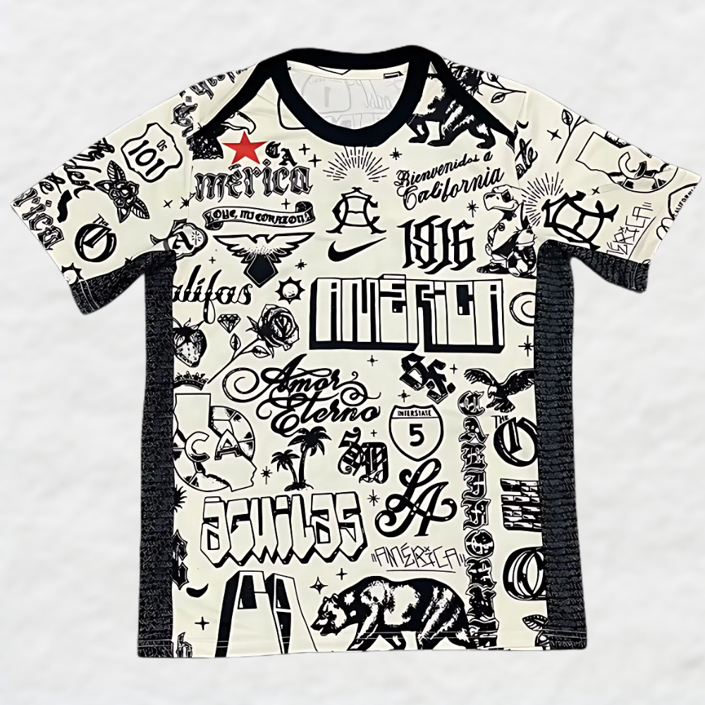 The CLUB AMERICA 2024/25 training shirt is predominantly off-white, with a dense array of street-style graphics on both the front and back for a truly unique look.