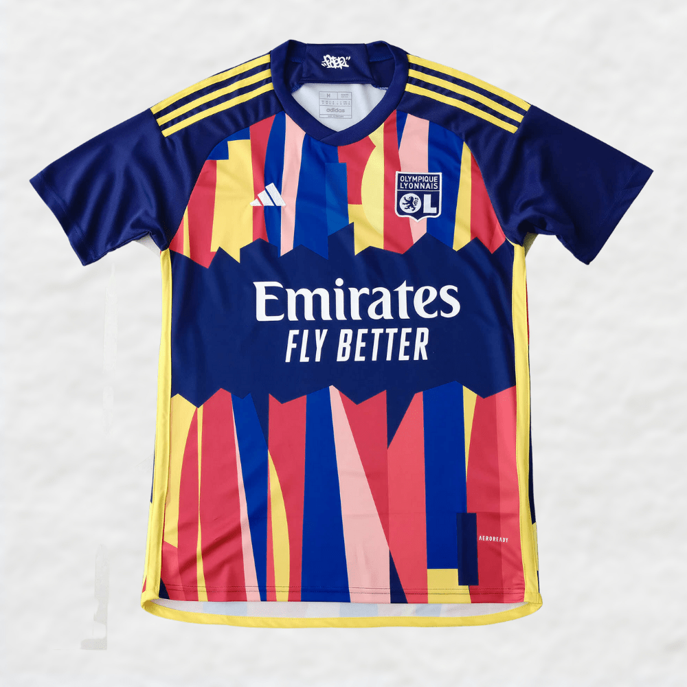 Presenting the brand new Olympique Lyonnais 2023/24 Third kit. You will find few jerseys with more colour than this bold yet stylish design. The shirt is part of a collaboration between the club Adidas, and French street artist Poter.