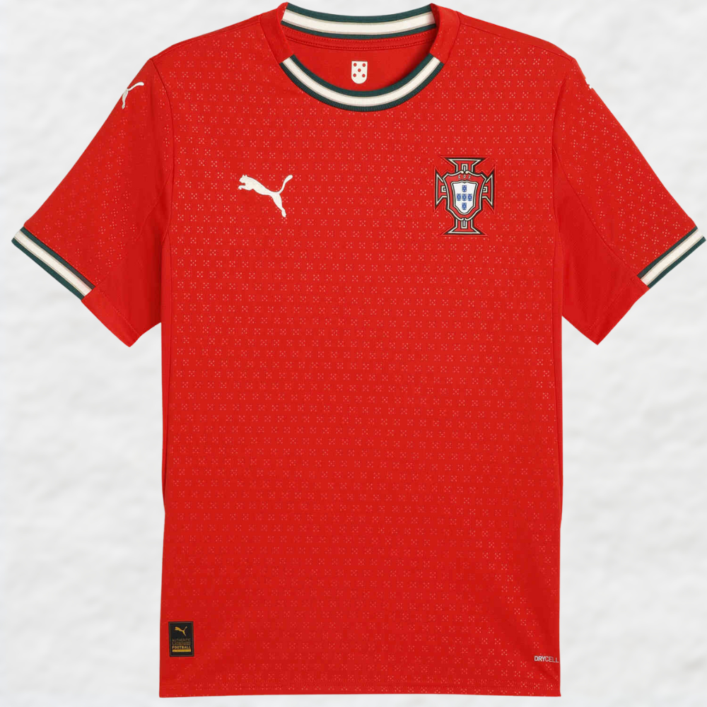 The Portugal 2025 Home Shirt by PUMA features a striking all-over cross pattern, a nod to the national crest, on a classic red base.