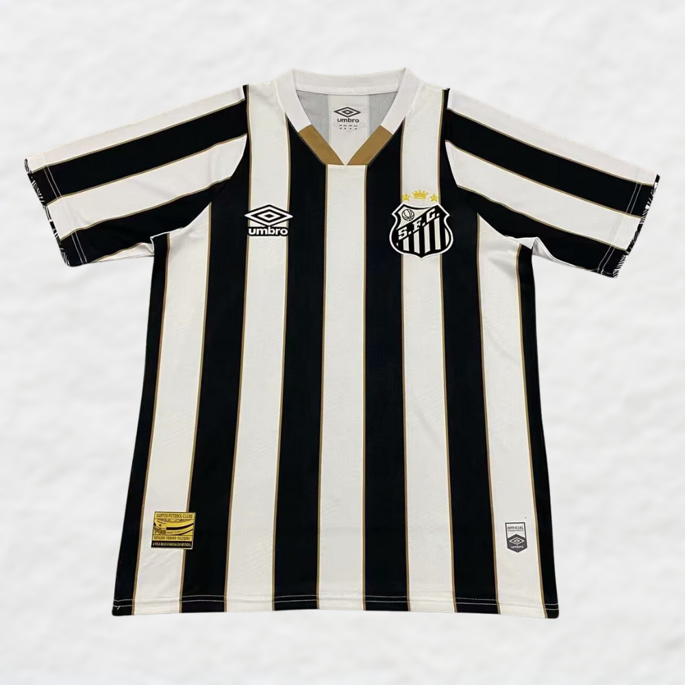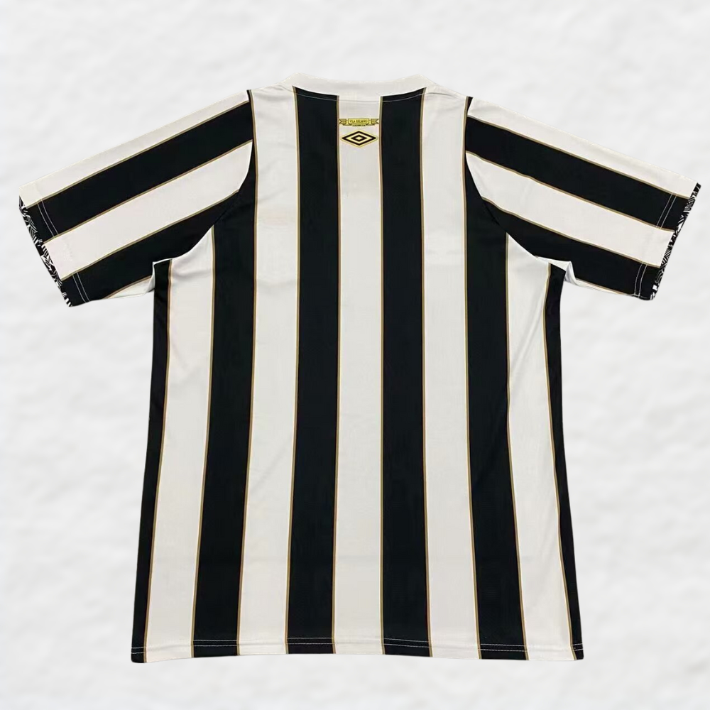 The Santos 2024/25 Away Shirt showcases the club's traditional colors with a modern twist, featuring a gold v-neck and stylish graphics.